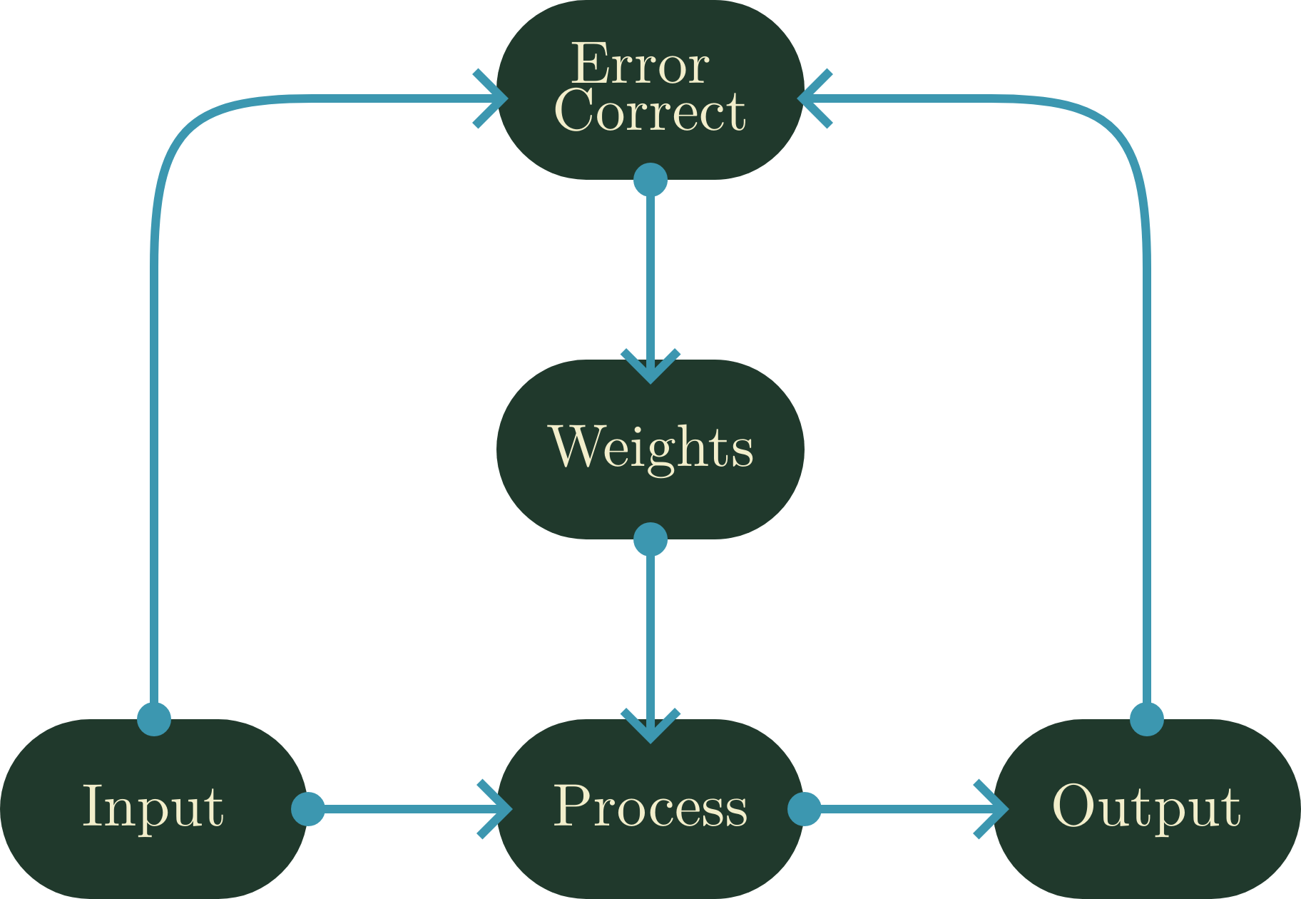 All ANNs may be placed in a training mode. In this mode, the old weights are used in a usual IPO fashion, and then they are adjusted through a means of back–propagation. This system, in a simple sense, is a second IPO-system that sets the weights of the neural network to values that lessen the “error” of the output8. This error is intentionally vague, as it could be anything: The wrong category for the input, a lower-scoring action in a game, or simply a deviation from a statistical norm. But importantly: This training is only done once; once it is finished, the ANN becomes a static system that acts according to its training.