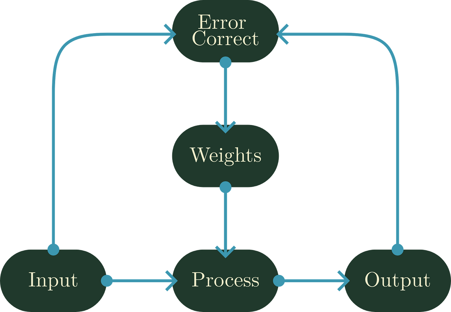 One of the most prevalent abstract models to explain computation is the input-process-output (IPO) model. This model is what’s known as feed–forward, where all information flows one-way through the logical system. This is a universal framework, and as such it is applied throughout nearly all computational tasks5. This model makes a notable and important claim: That the logical system is independent of the environment, and as such feedback is incapable of changing the system itself. Instead, the system must have explicit understanding of each input state in order to act accordingly.